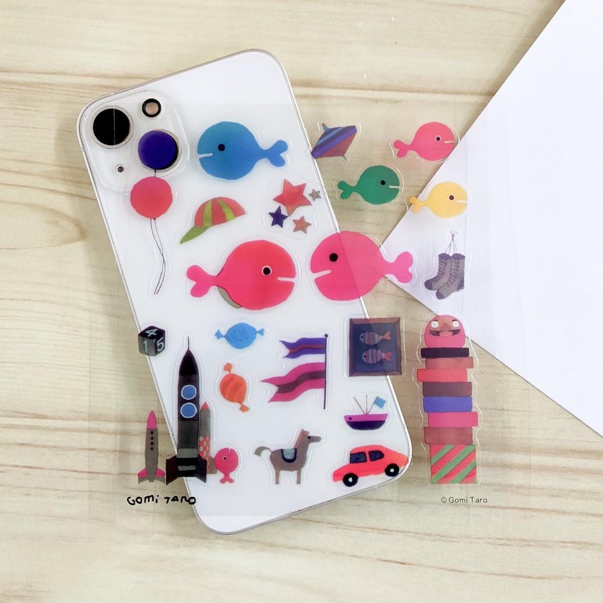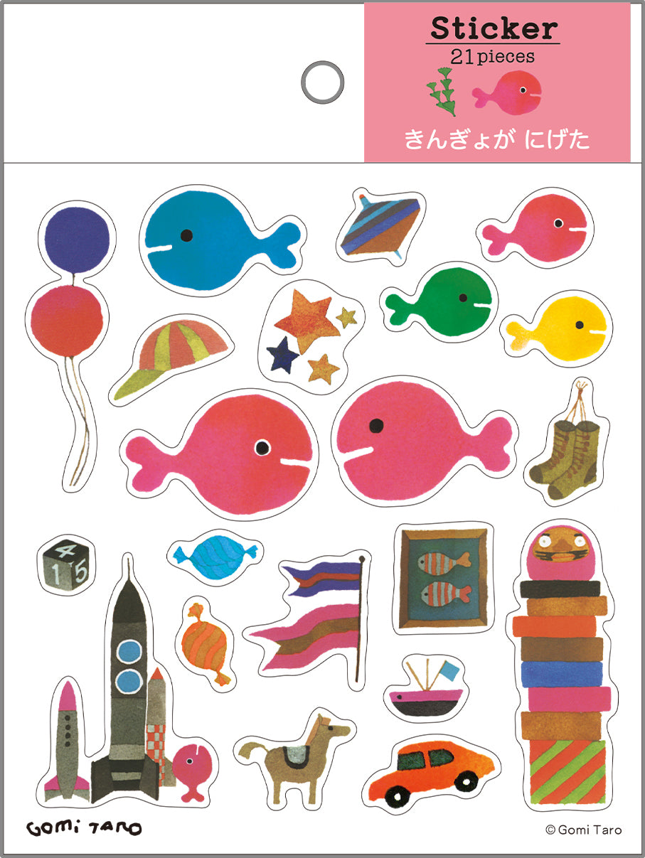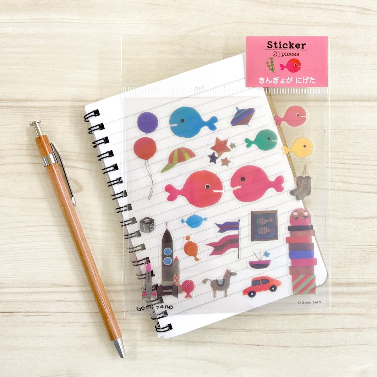 『きんぎょがにげた』のカラフルでポップな透明シール。透明なので、本体の色を生かして色々なものをデコレーションできます。カラーペンやマスキングテープの上に貼ると、さらに華やかに!21枚入り