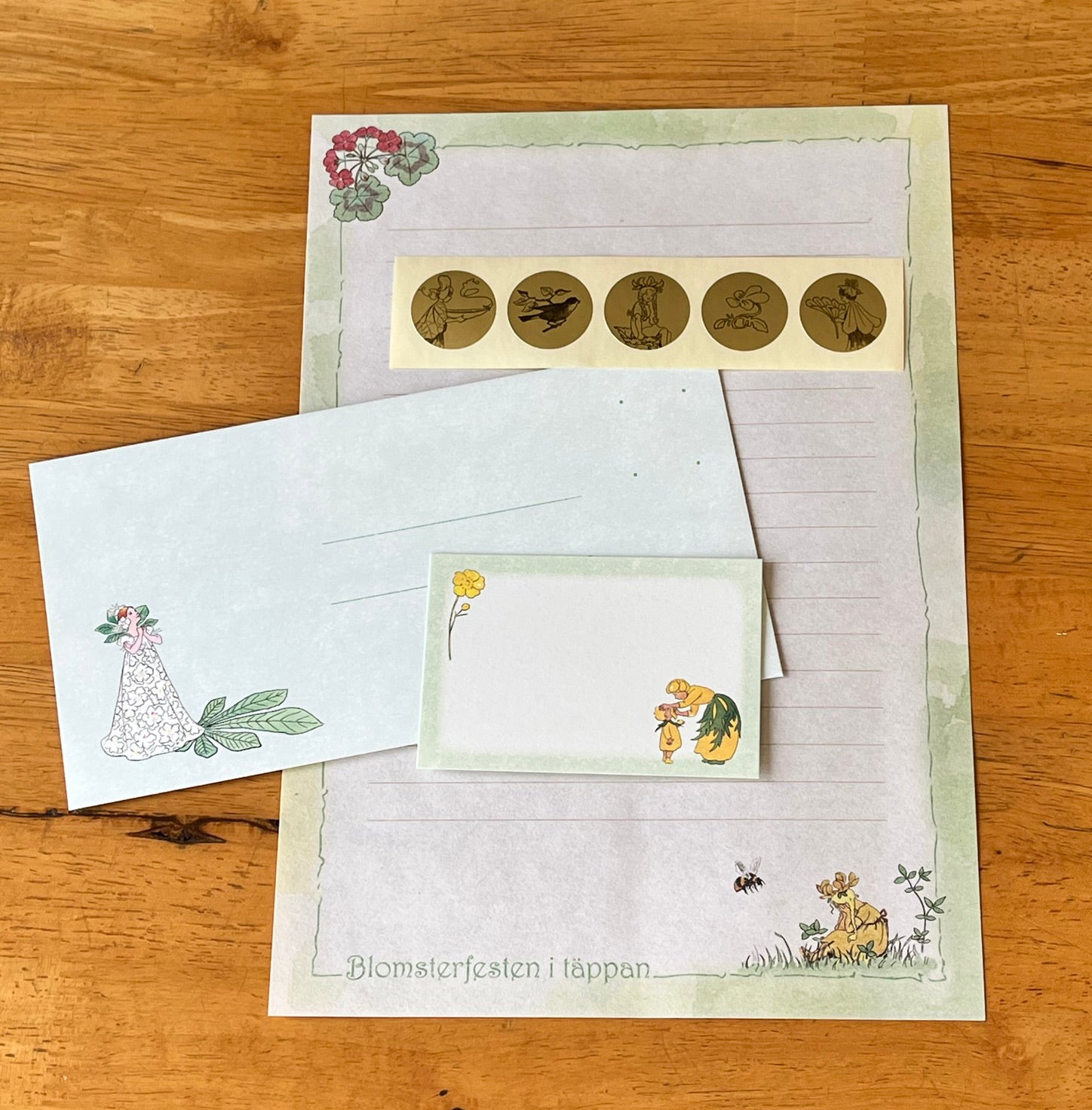 『リーサの庭の花まつり』から誕生したレターセットです。セット内容:便箋(25.5×18㎝)10枚、封筒(10×19㎝)5枚、ミニカード5枚、シール5枚