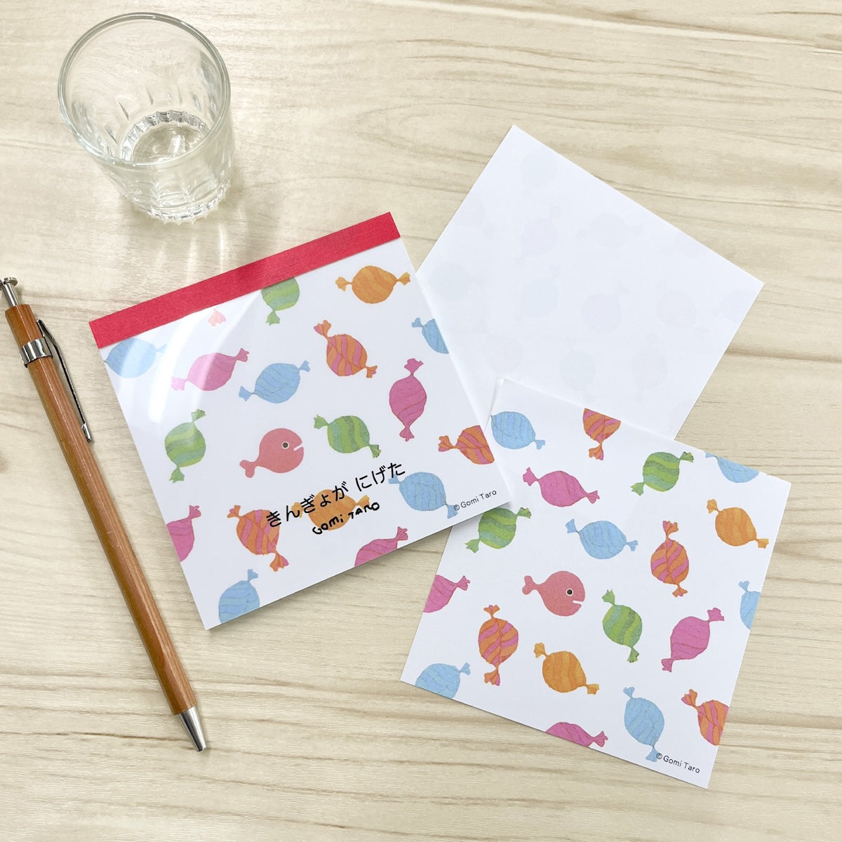 正方形で使いやすいスクエアメモ!『きんぎょがにげた』にぴったりのポップでカラフルなデザインです!コンパクトなので持ち運びしやすい&一言添えて渡すのにもちょうどいいサイズ感です。