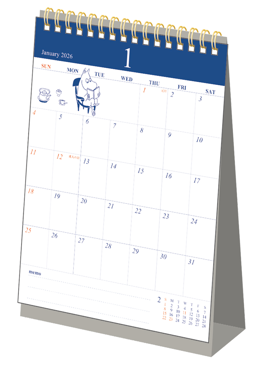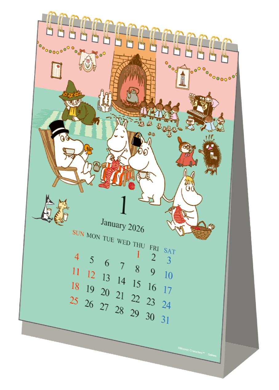 ムーミンの人気キャラクターが勢揃いしたシーンだけを詰め込んだ、卓上カレンダー。にぎやかなムーミン谷の仲間たちがあなたの毎日を楽しく彩ってくれます。表:イラスト+月間、裏:月間ブロック、両面使える卓上カレンダーです。【仕様】Wリング、両面印刷、表面フルカラー、裏面2色印刷、台紙卓上タイプ、14枚、中国製