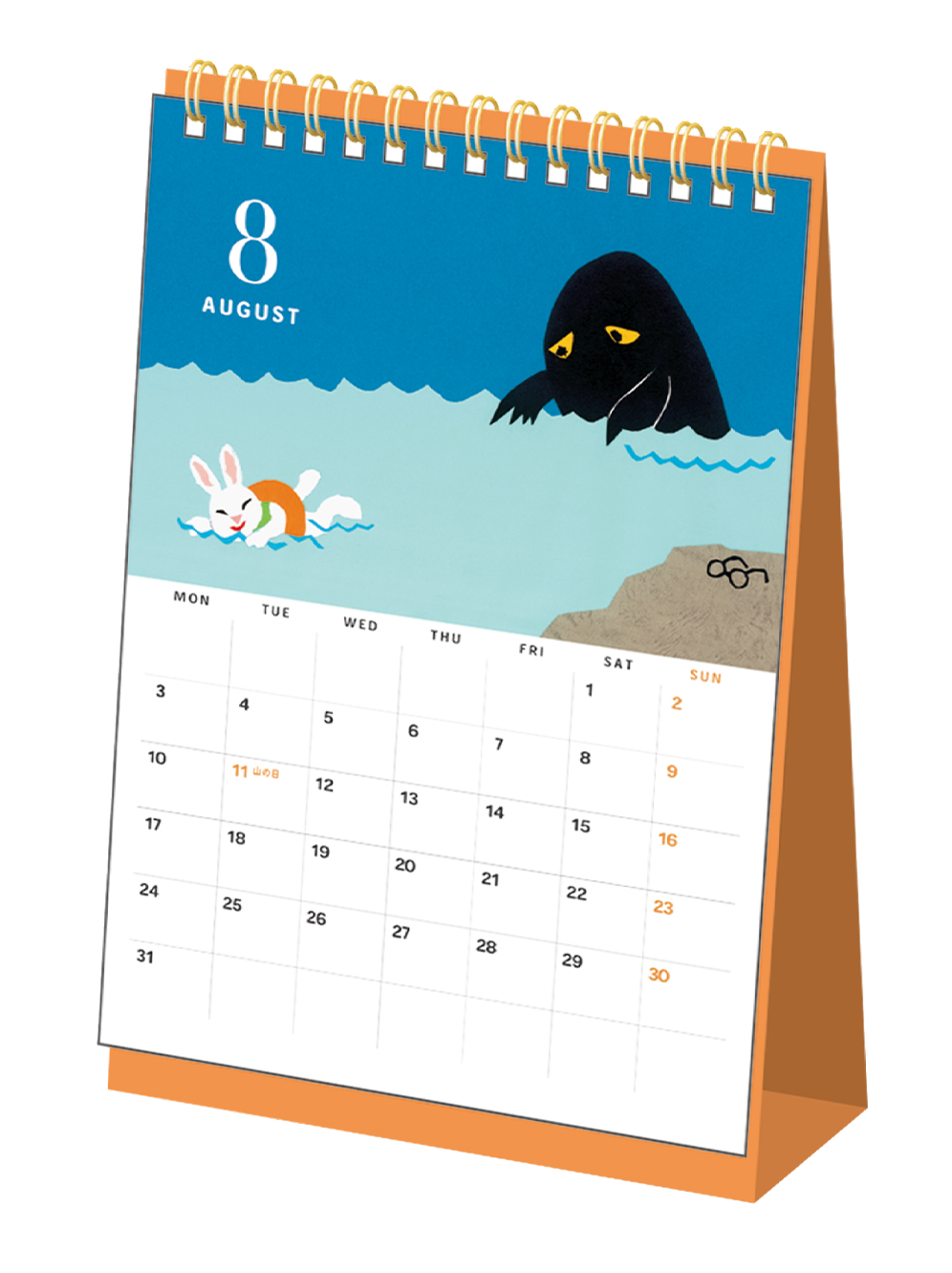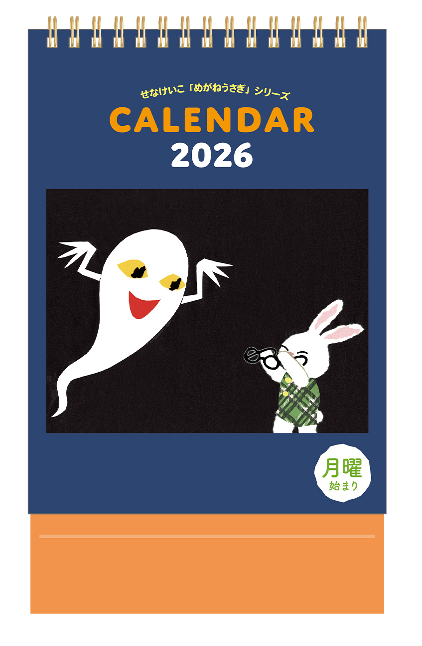 「めがねうさぎ」シリーズの予定が書きこめるタイプのカレンダーです。めがねうさぎやおばけのほっこりするイラストの数々が楽しいデザインです。【仕様】Wリング、台紙卓上タイプ、両面印刷、8枚、中国製